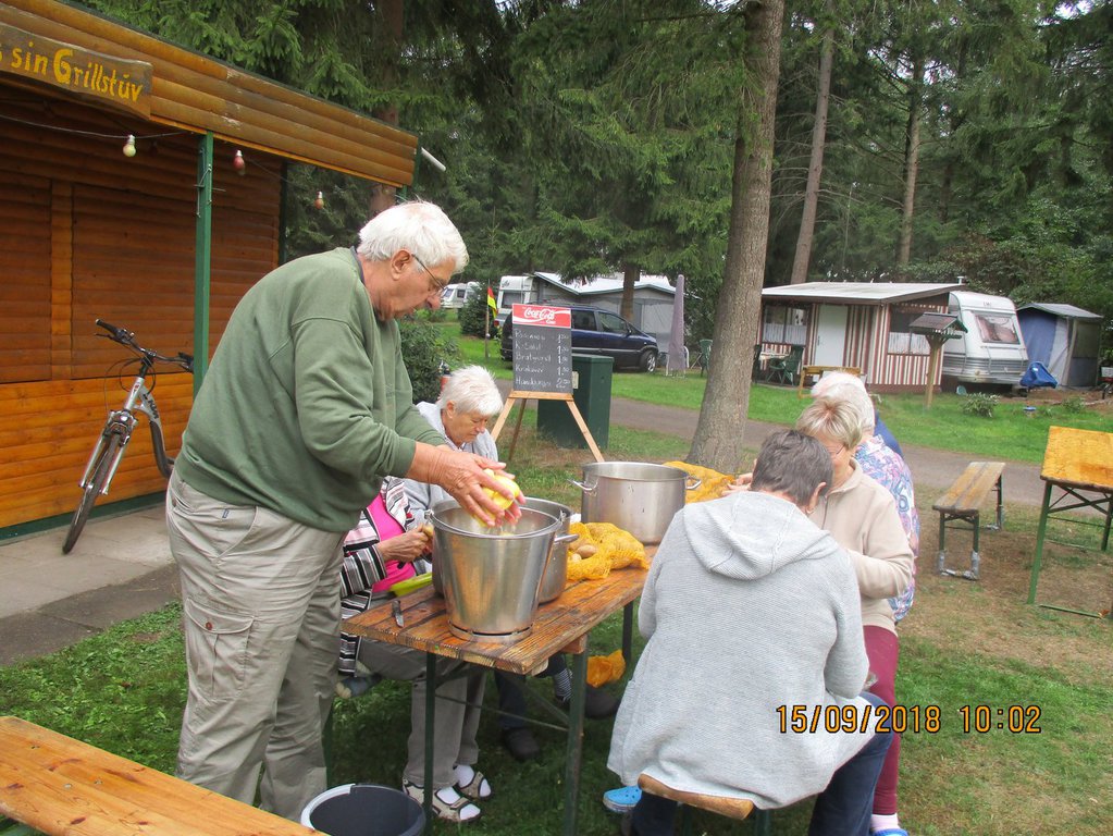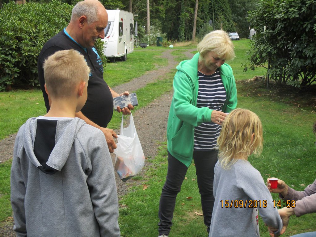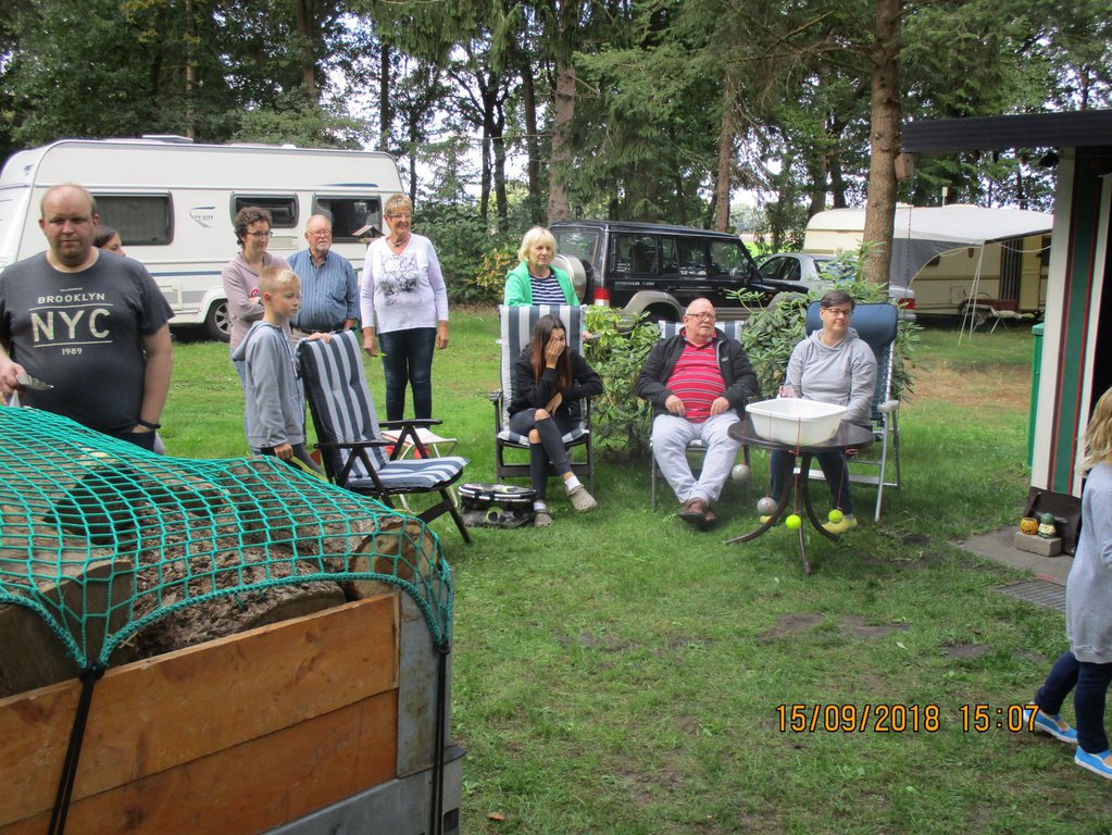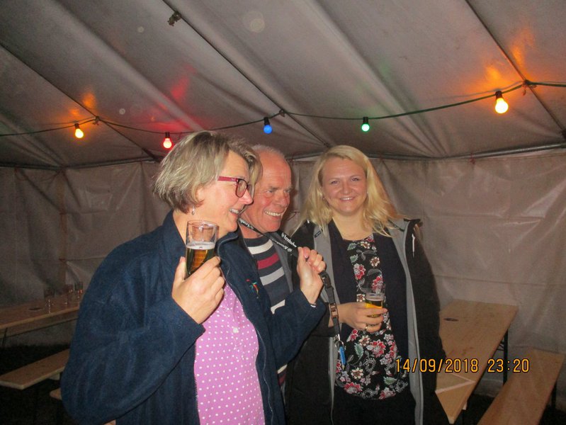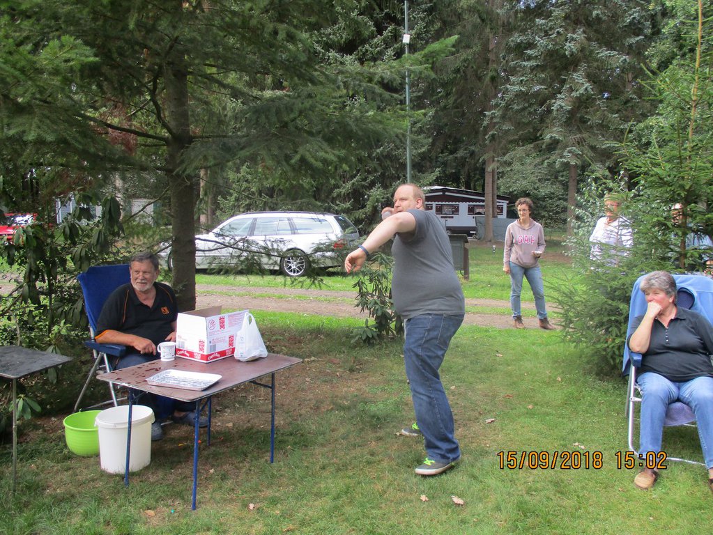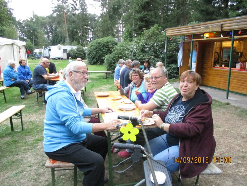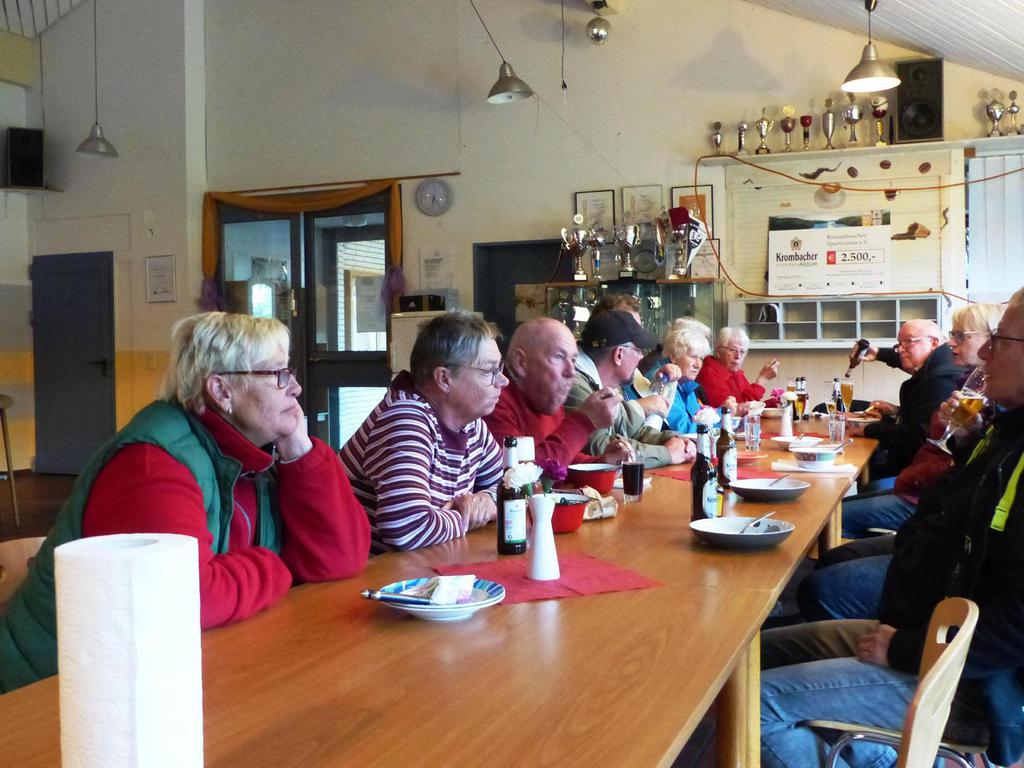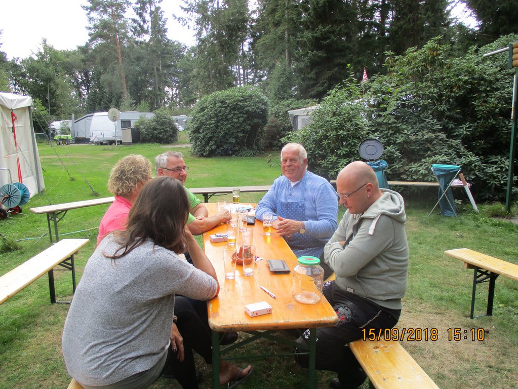 Mittags am Freitag hatte Hans eine norddeutsche Spezialität zubereitet - Knipp mit sauren Gurken und Rote Bete. Am Nachmittag besuchten wir das Gut Moorbeck, das direkt an unseren Platz angrenzt. Bernhard Kempermann, der Fremdenführer aus Großenkneten hat uns einen Vortrag über frühe Besiedlungen bis zur jüngeren Geschichte im Gasthaus gehalten. Obwohl wir nur wenige Schritte vom Platz entfernt waren, wurde unser Horizont mächtig erweitert. Frau von Aschwege, die neue Eigentümerin des Gutes, war von unserem Plan der Besichtigung sehr angetan und sofort bereit an dem Treffen teilzunehmen um ihre künftigen Nachbarn kennenzulernen. Sie will das Gasthaus und die alte Wassermühle, die unter Denkmalschutz stehen, sowie das Hotel mit Gastronomie und einem Kongresszentrum wiederbeleben. Sie hat uns gern ihre Pläne erläutert. Am Abend fand der große Spieleabend statt. Beim Skat- und Uno-Turnier war der Clubraum wieder voll gefüllt. Als Füllung für hungrige Mägen wurden Hackepeterbrötchen gereicht. Preise gab's natürlich wieder für alle Teilnehmer.