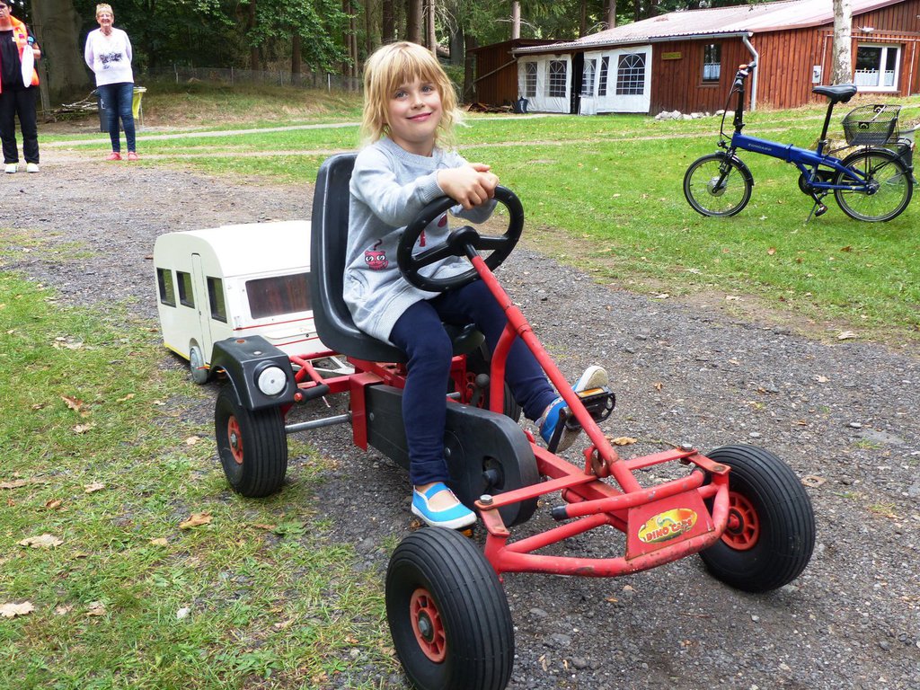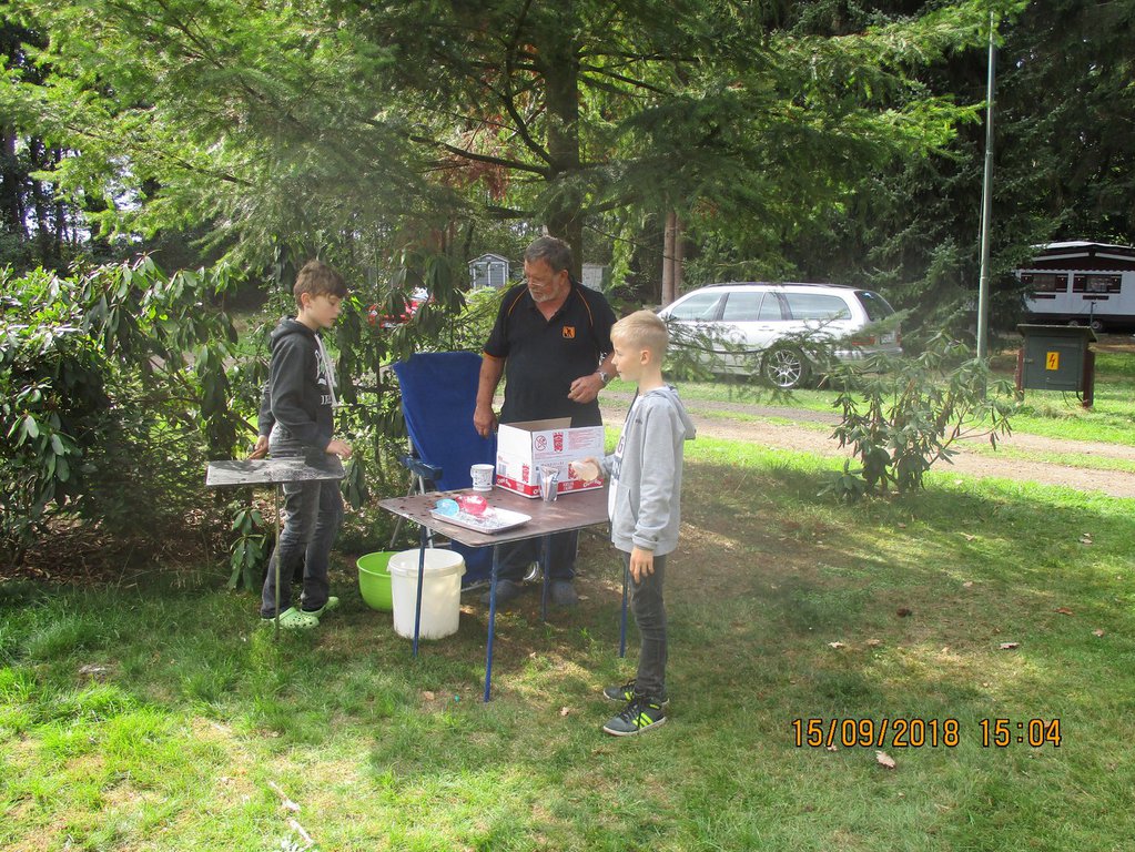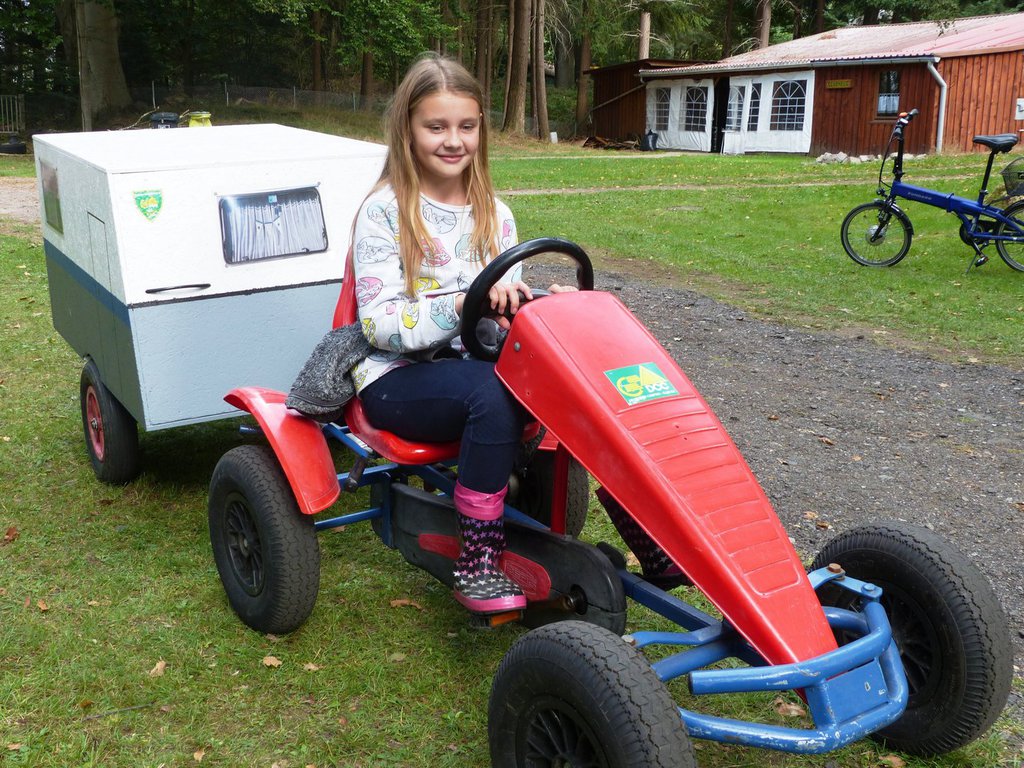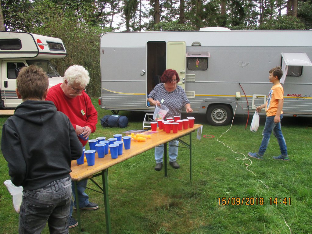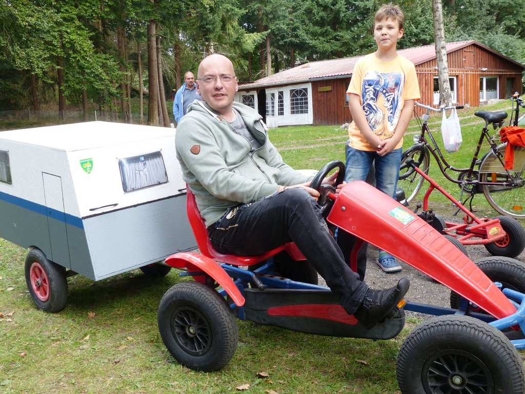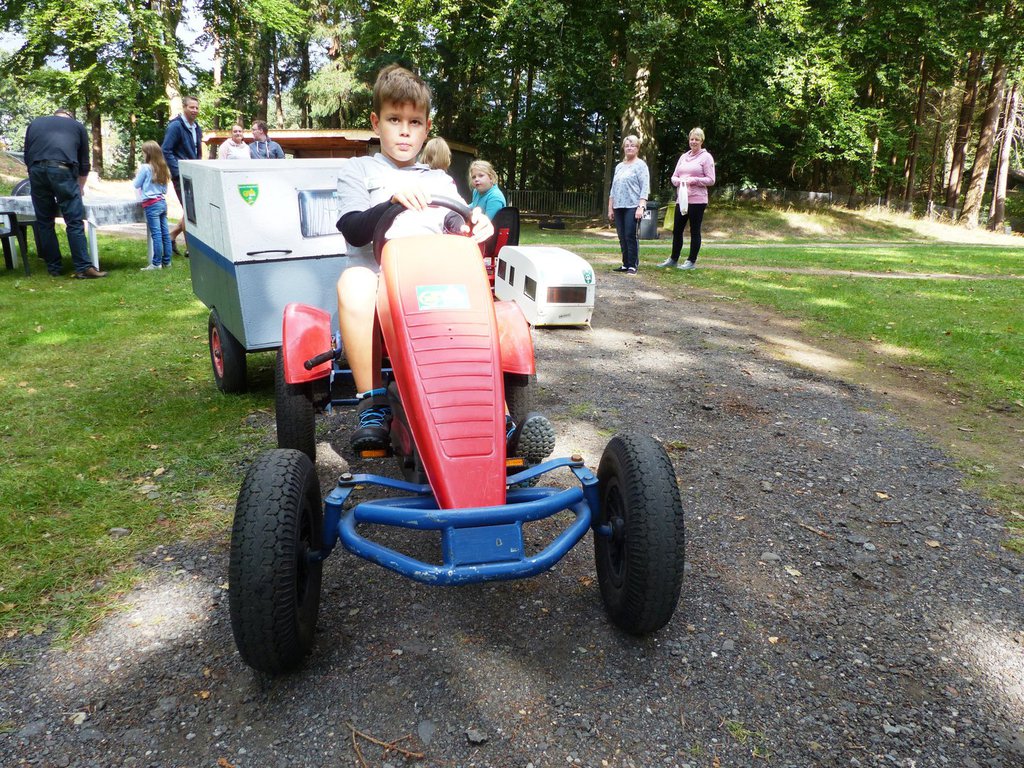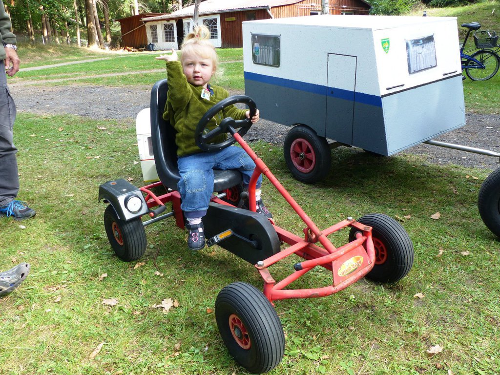 Am Sonnabend fertigten die Kinder bei einer Bastelstunde Fische und anderes Seegetier für die vorbereiteten Aquarien-Gläser. Hans hatte zu Mittag eine deftige Kartoffelsuppe zubereitet, für die Kleinen gab es alternativ auch Pommes. So gestärkt ging es zur Spielerallye. Ein Laufzettel sorgte dafür, dass auch keine der über den ganzen Platz verteilten Stationen verpasst wurde. Für jedes Mitmachen gab es süße Belohnungen. Die besondere Attraktion waren dann zwei Wohnwagengespanne - Kettcar mit kleinen Wohnwagen als Anhänger, mit denen ein Parcours befahren wurde. Danach wieder eine Stärkung am Kuchenbuffet.