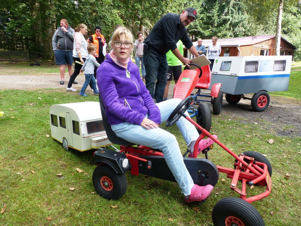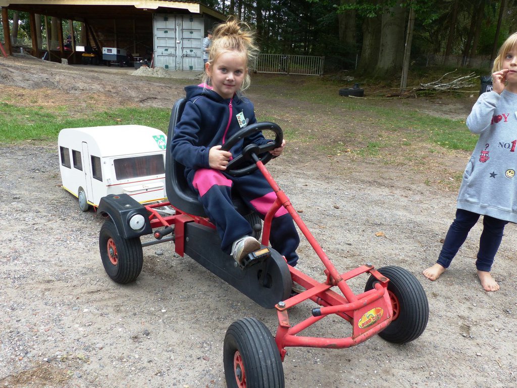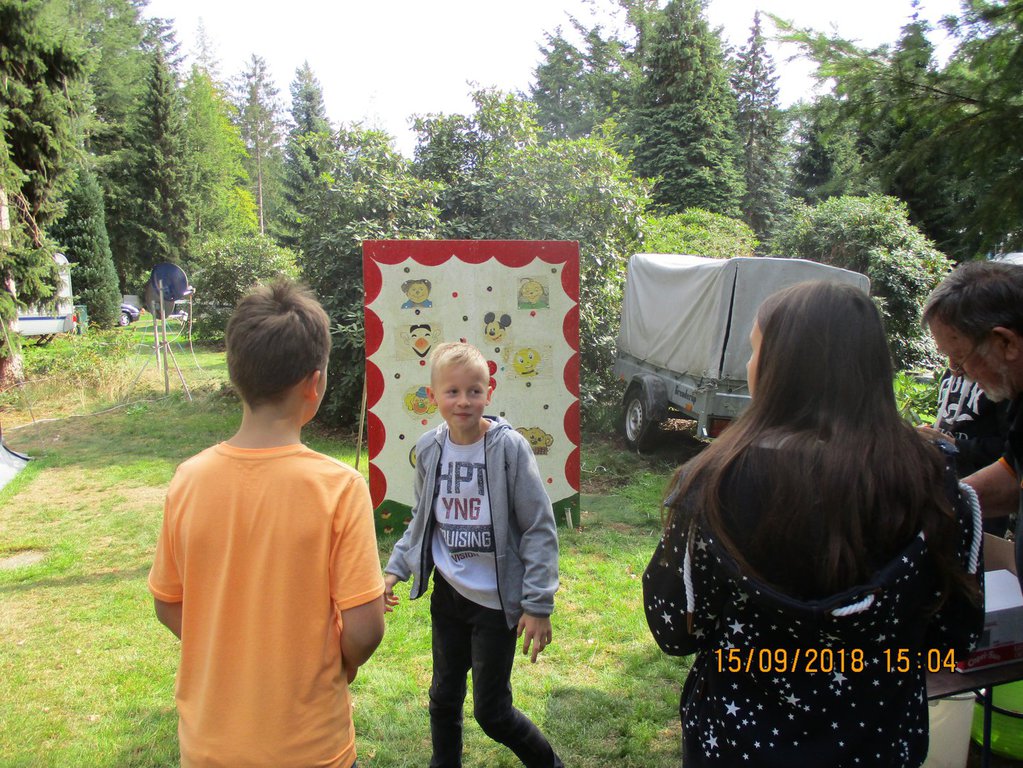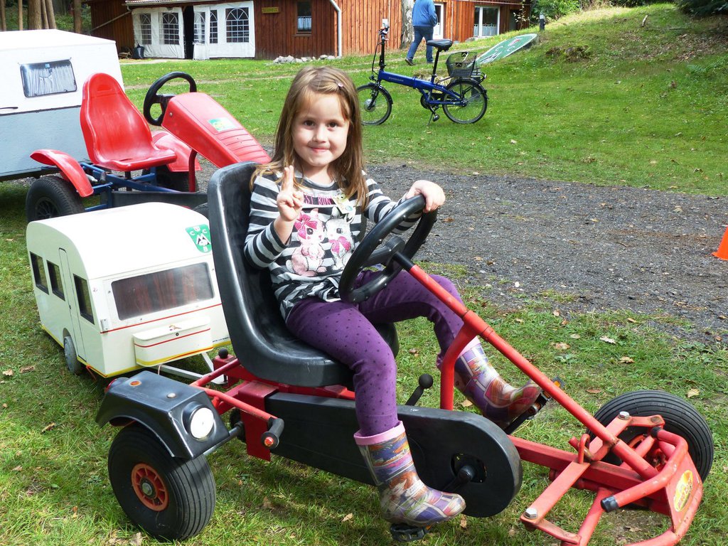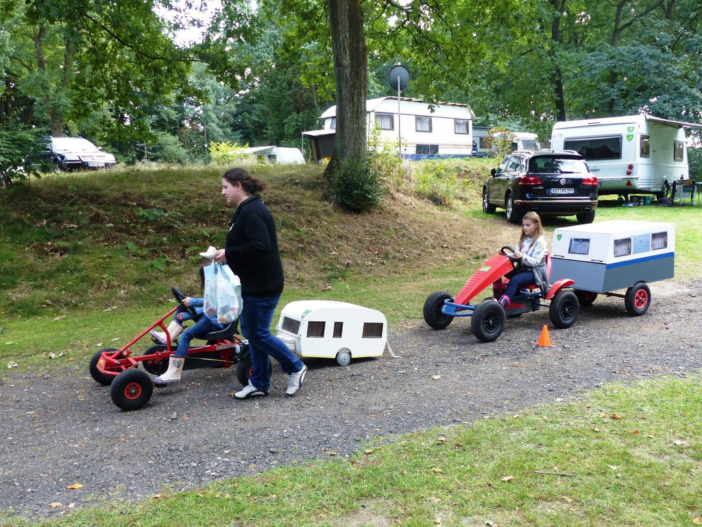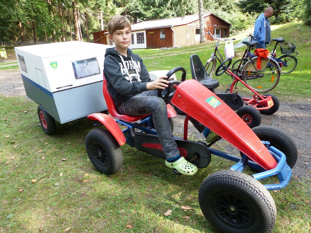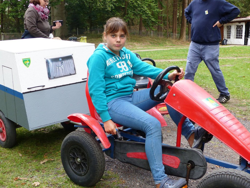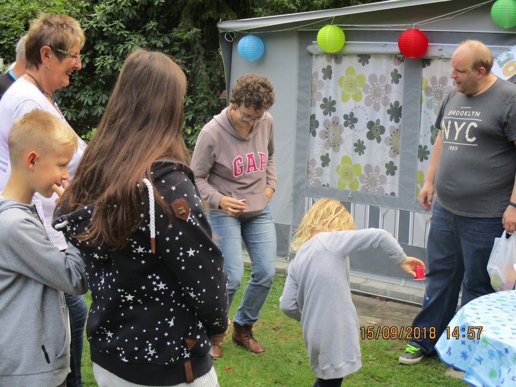 Am Sonnabend fertigten die Kinder bei einer Bastelstunde Fische und anderes Seegetier für die vorbereiteten Aquarien-Gläser. Hans hatte zu Mittag eine deftige Kartoffelsuppe zubereitet, für die Kleinen gab es alternativ auch Pommes. So gestärkt ging es zur Spielerallye. Ein Laufzettel sorgte dafür, dass auch keine der über den ganzen Platz verteilten Stationen verpasst wurde. Für jedes Mitmachen gab es süße Belohnungen. Die besondere Attraktion waren dann zwei Wohnwagengespanne - Kettcar mit kleinen Wohnwagen als Anhänger, mit denen ein Parcours befahren wurde. Danach wieder eine Stärkung am Kuchenbuffet.