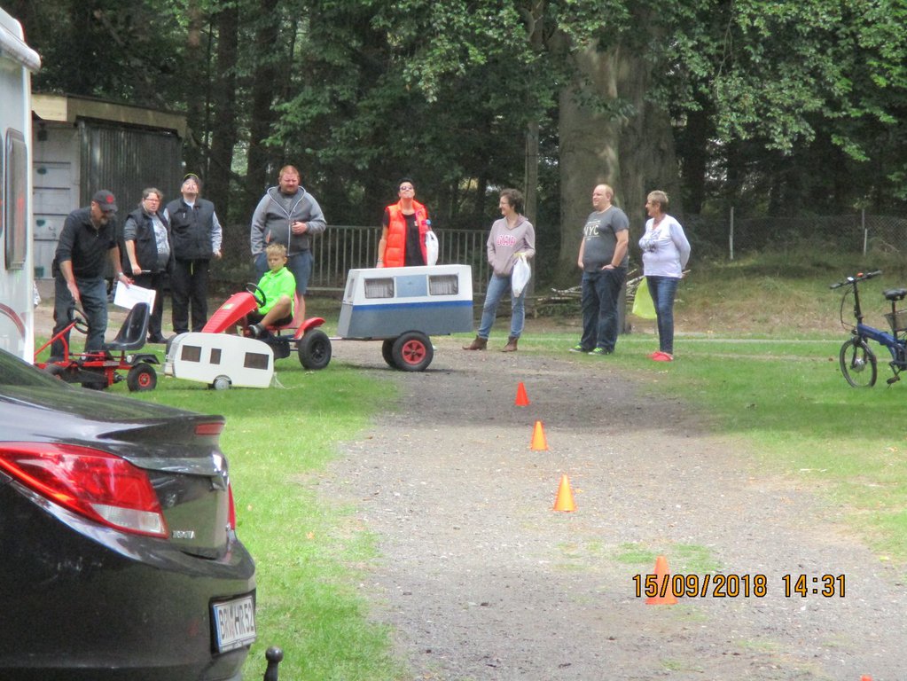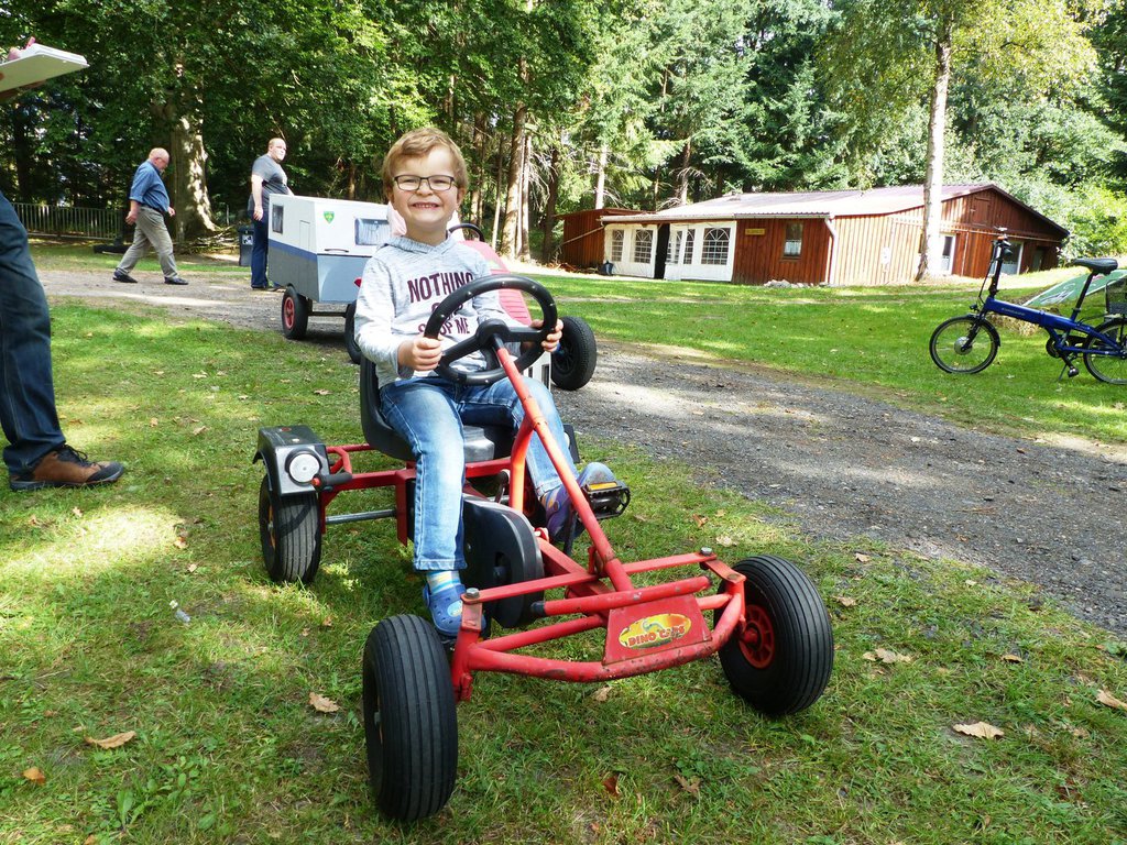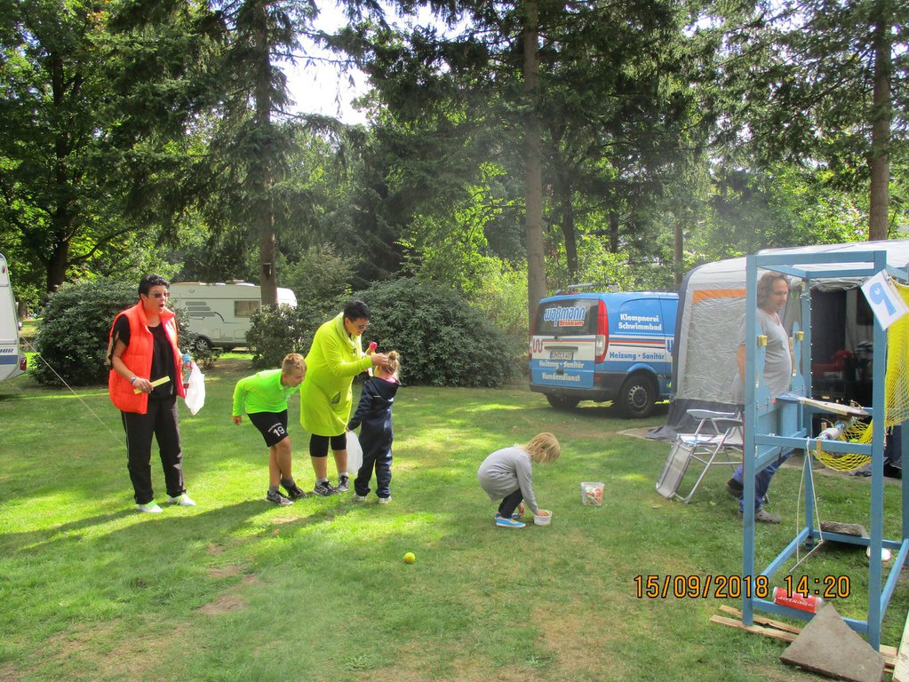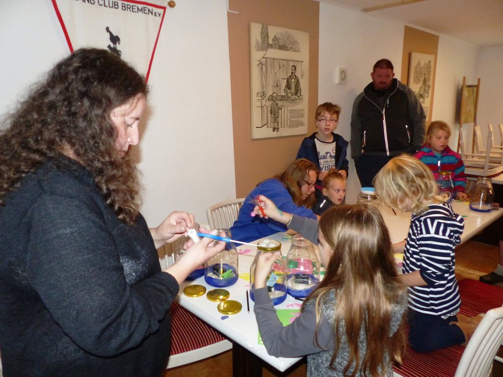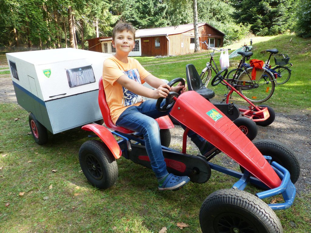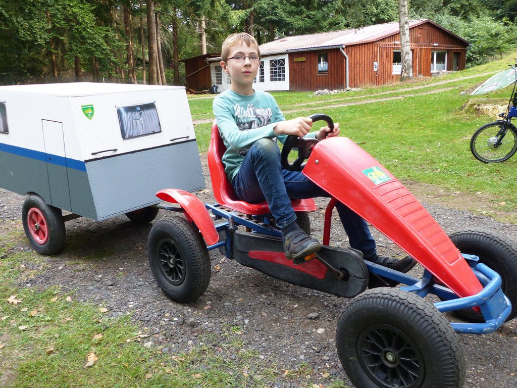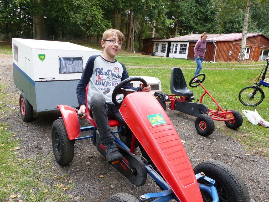 Am Sonnabend fertigten die Kinder bei einer Bastelstunde Fische und anderes Seegetier für die vorbereiteten Aquarien-Gläser. Hans hatte zu Mittag eine deftige Kartoffelsuppe zubereitet, für die Kleinen gab es alternativ auch Pommes. So gestärkt ging es zur Spielerallye. Ein Laufzettel sorgte dafür, dass auch keine der über den ganzen Platz verteilten Stationen verpasst wurde. Für jedes Mitmachen gab es süße Belohnungen. Die besondere Attraktion waren dann zwei Wohnwagengespanne - Kettcar mit kleinen Wohnwagen als Anhänger, mit denen ein Parcours befahren wurde. Danach wieder eine Stärkung am Kuchenbuffet.