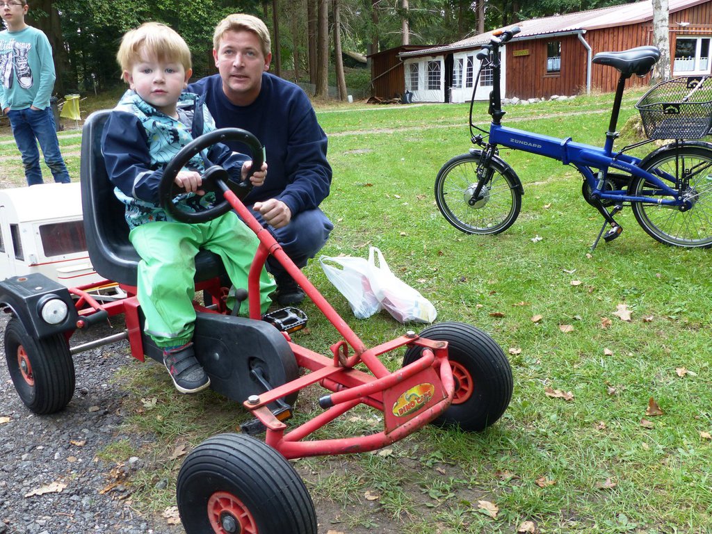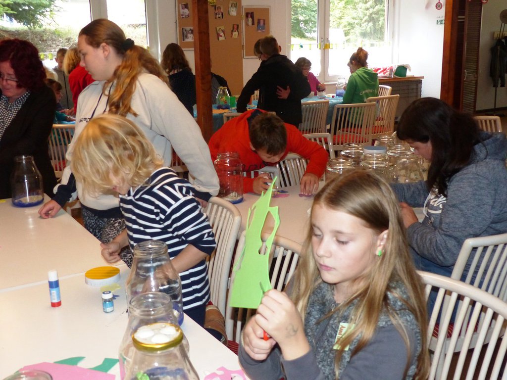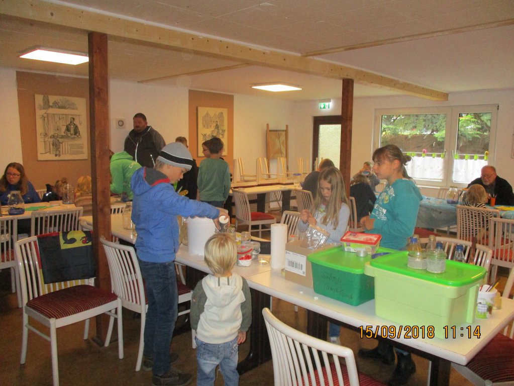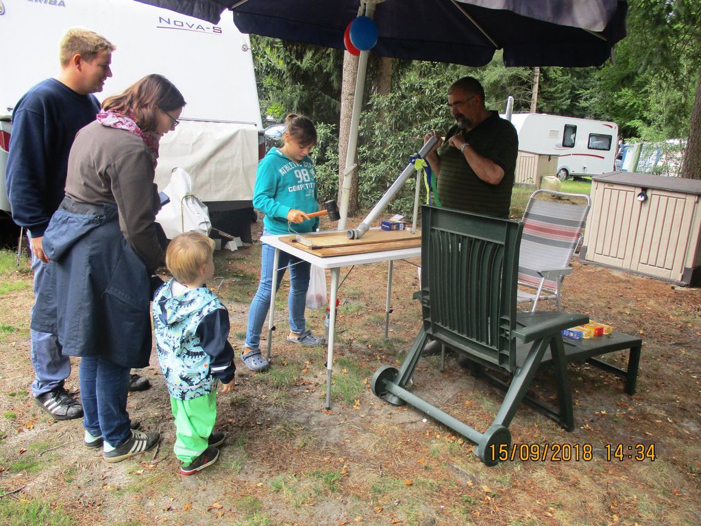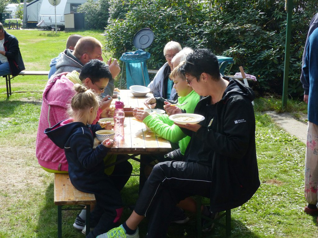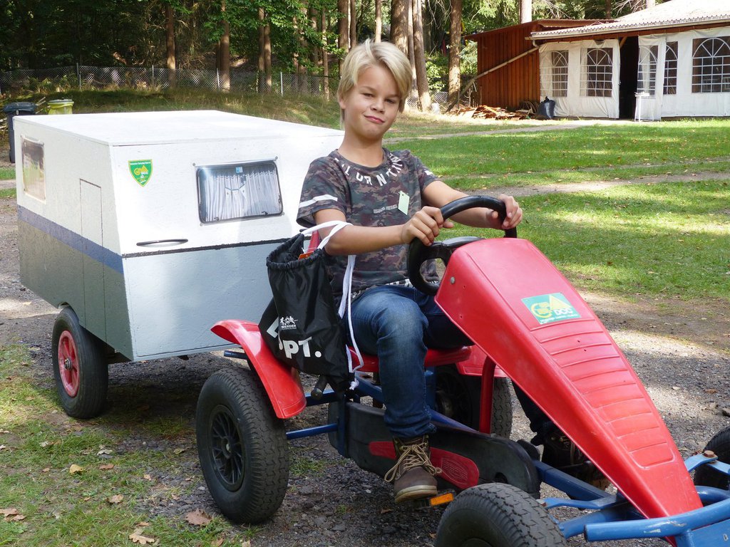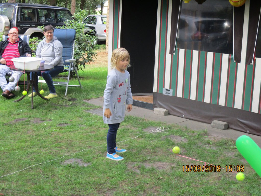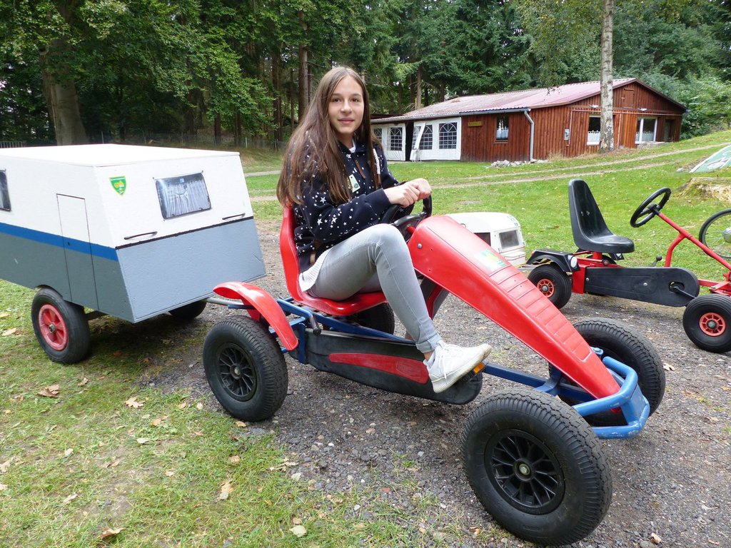 Am Sonnabend fertigten die Kinder bei einer Bastelstunde Fische und anderes Seegetier für die vorbereiteten Aquarien-Gläser. Hans hatte zu Mittag eine deftige Kartoffelsuppe zubereitet, für die Kleinen gab es alternativ auch Pommes. So gestärkt ging es zur Spielerallye. Ein Laufzettel sorgte dafür, dass auch keine der über den ganzen Platz verteilten Stationen verpasst wurde. Für jedes Mitmachen gab es süße Belohnungen. Die besondere Attraktion waren dann zwei Wohnwagengespanne - Kettcar mit kleinen Wohnwagen als Anhänger, mit denen ein Parcours befahren wurde. Danach wieder eine Stärkung am Kuchenbuffet.