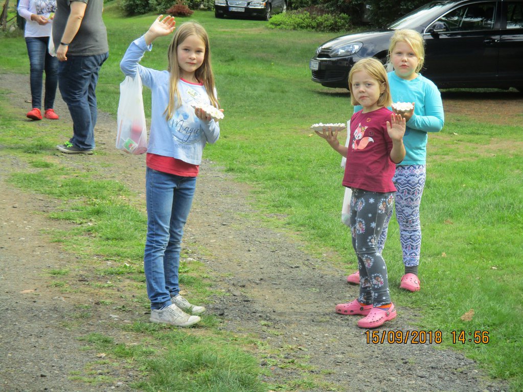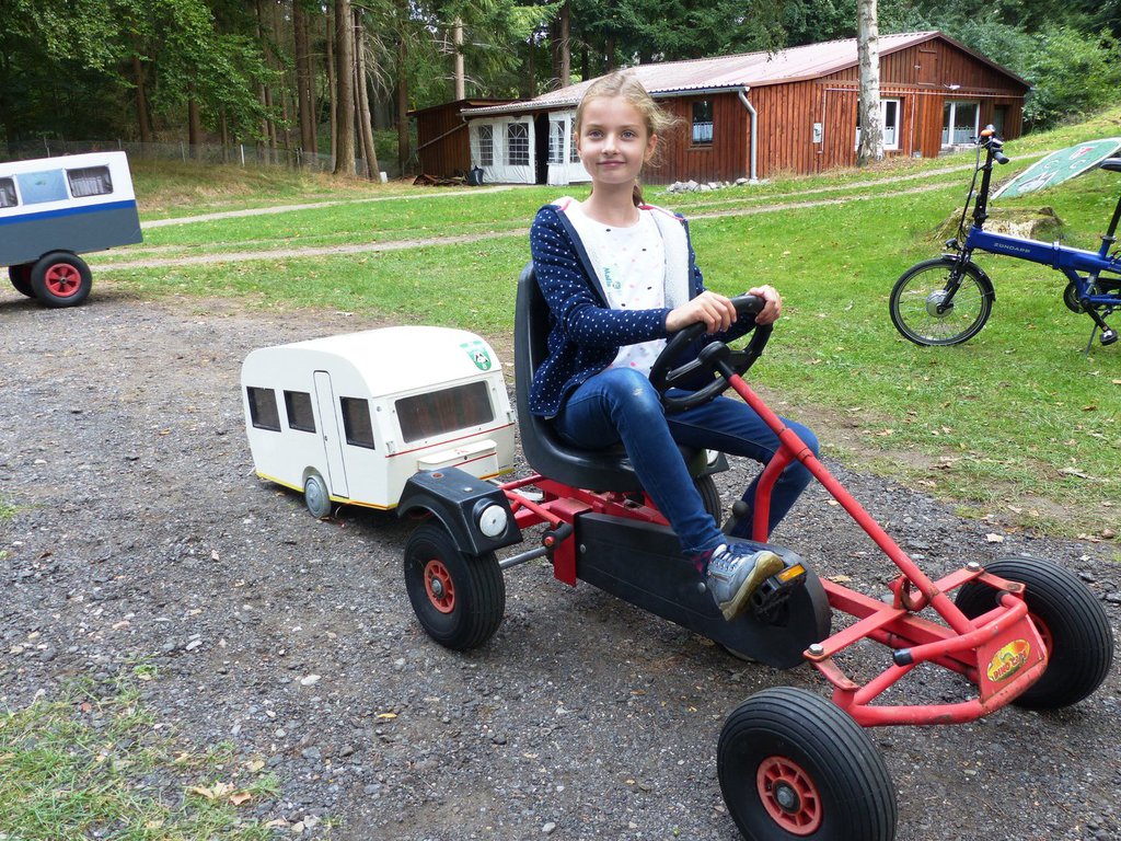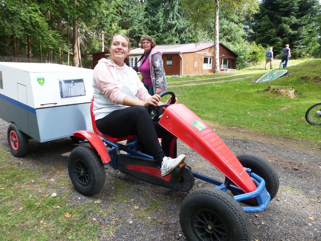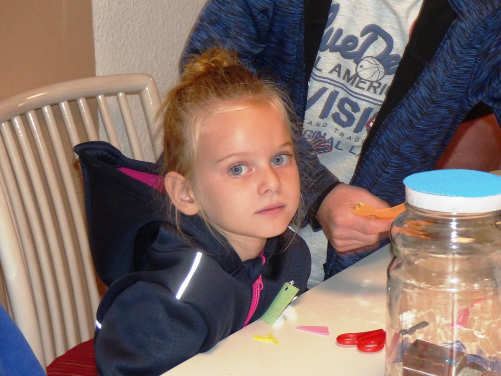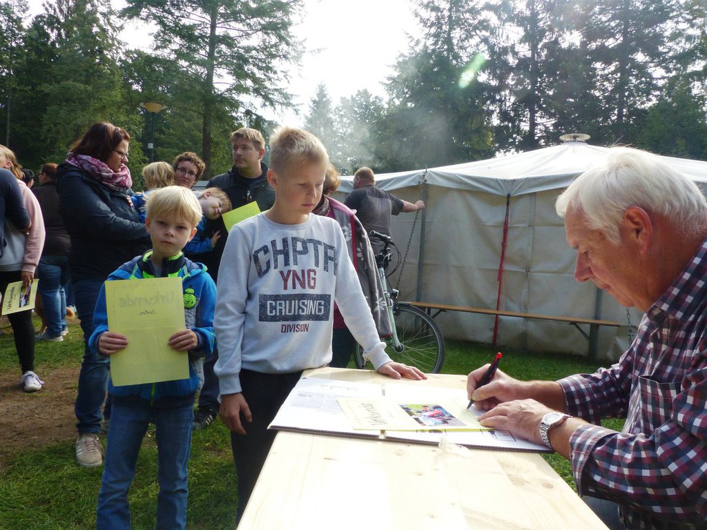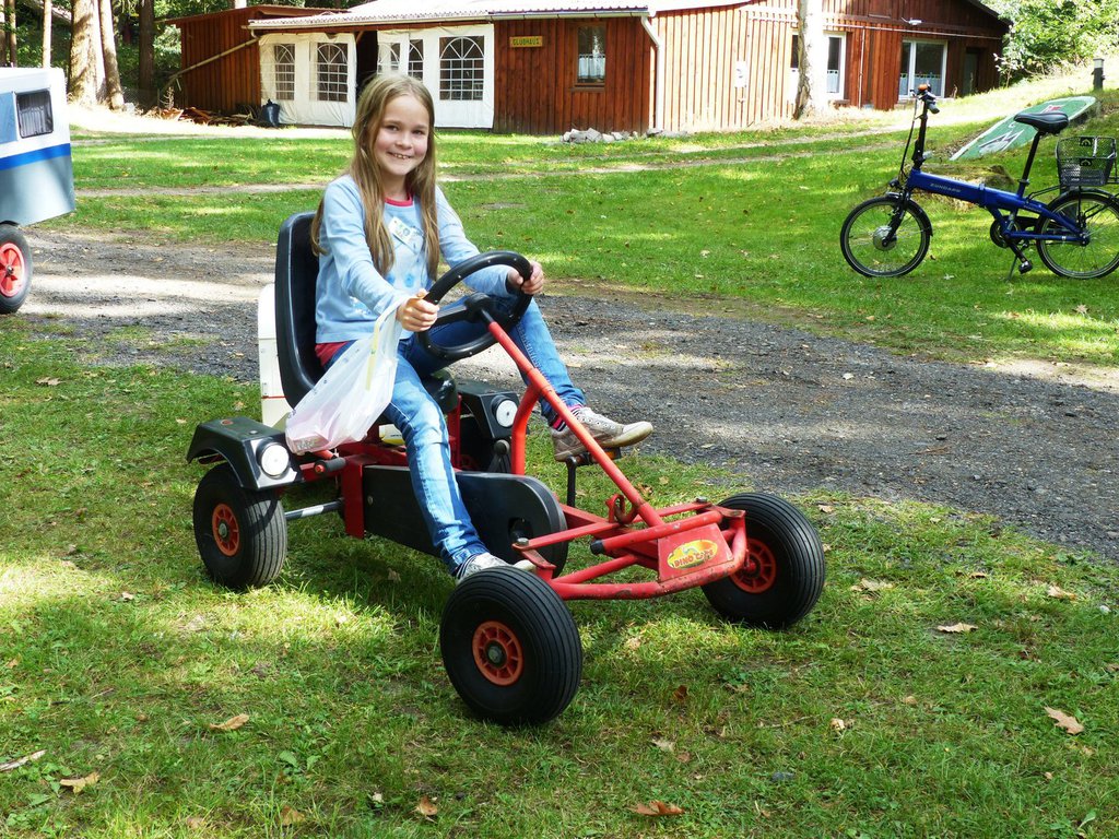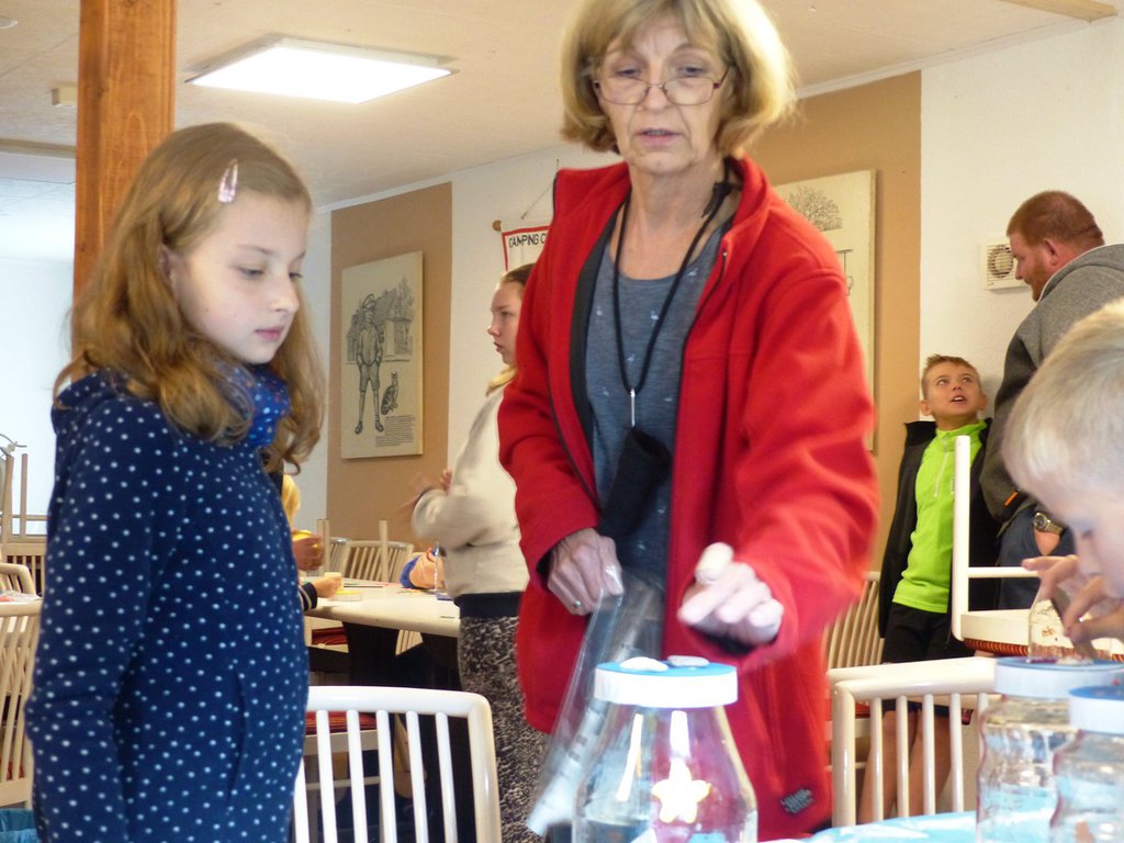 Am Sonnabend fertigten die Kinder bei einer Bastelstunde Fische und anderes Seegetier für die vorbereiteten Aquarien-Gläser. Hans hatte zu Mittag eine deftige Kartoffelsuppe zubereitet, für die Kleinen gab es alternativ auch Pommes. So gestärkt ging es zur Spielerallye. Ein Laufzettel sorgte dafür, dass auch keine der über den ganzen Platz verteilten Stationen verpasst wurde. Für jedes Mitmachen gab es süße Belohnungen. Die besondere Attraktion waren dann zwei Wohnwagengespanne - Kettcar mit kleinen Wohnwagen als Anhänger, mit denen ein Parcours befahren wurde. Danach wieder eine Stärkung am Kuchenbuffet.
